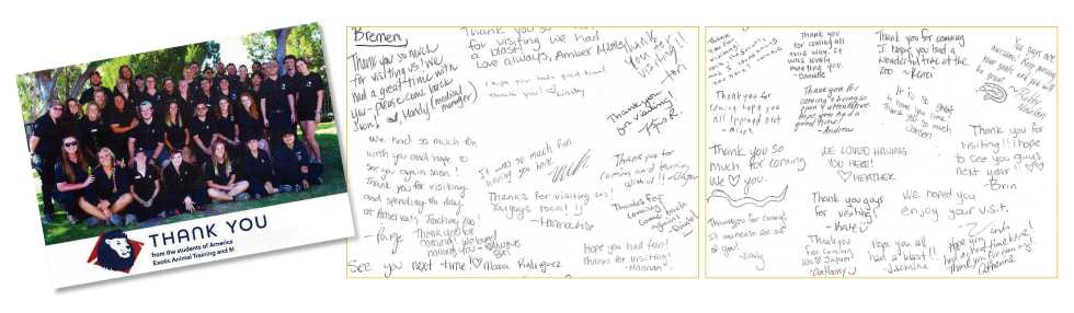 ブレーメンの提携大学である「モアパーク大学(アメリカ・ロサンゼルス)」で、研修をさせていただきました。大学内には動物園が併設されていて、草食動物から肉食動物、猛禽類までいます。大学内とは思えないほどたくさんの動物たちと出会うことができました。中には、保護された動物たちもいて、動物愛護の観点からも学ぶことがたくさんありました。モアパーク大学を卒業され、ハリウッドで活躍中のアニマルトレーナーさんと動物のアクション披露やふれあい、大学内で行われるハズバンダリー実習やアニマルナーシング実習なども経験しました。大学の学生のみなさんが用意してくれたランチを一緒にとったり、学生さんたちや先生方との交流も深まりました。同じ動物の職業を目指す者として、「まだまだ頑張ろう」という刺激をもらうことができました。学生のみなさんは、動物たちと過ごす学生生活を心の底から楽しんでいるんだなと感じることができ、キラキラしていたのが印象的でした。